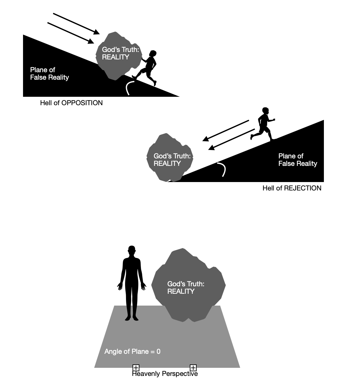 Another way to look at this analogy would be to imagine the GOD boulder of Reality sitting at the bottom of a valley immovable. We however, are turned away from GOD to flee His Reality and Truth and fight to gain distance from Him. The hill side leading away is still a plane pitched to the degree of our deception and False Reality. The higher the degree of deception, the more difficult the struggle to climb away from GOD. It requires more work to fight the pull of gravity drawing us into Reality. This is the Hell of Rejection. We reject GOD, Truth and Reality.